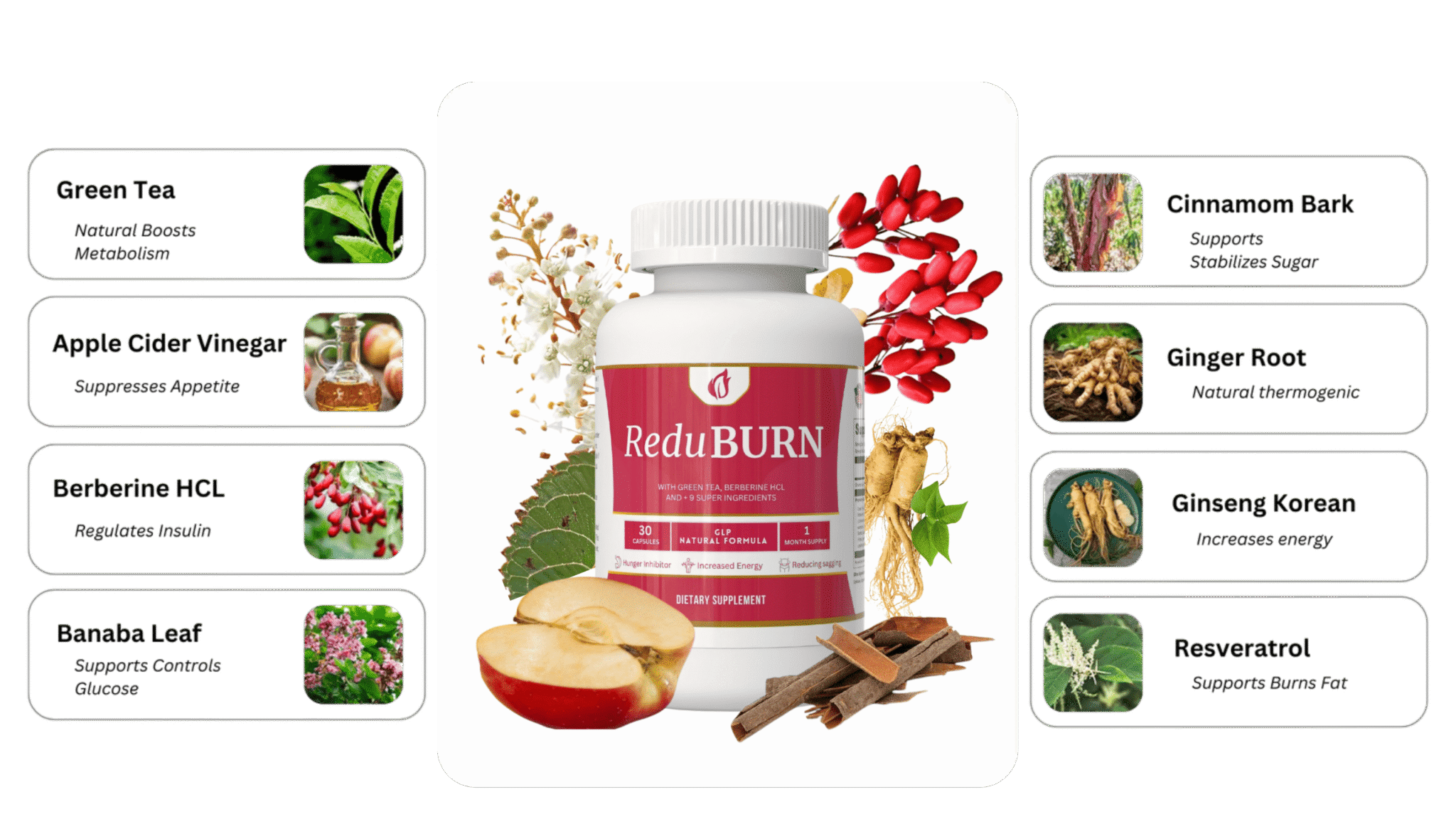 ReduBurn targets the root cause of weight gain, activating your body’s natural fat-burning process, boosting metabolism, and restoring balance